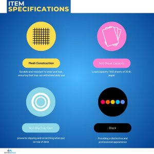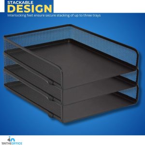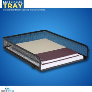 Bandeja de cartas para la organización de la oficina. Los pies entrelazados garantizan un apilamiento seguro de hasta tres bandejas Los bordes planos y redondeados ofrecen un diseño más elegante. Capacidad de carga: 543 hojas de 19.8 lbs. Papel Bandeja de papel negra de malla y alambre que añade estilo, eficiencia y productividad a tu escritorio Las patas de la bandeja evitan resbalones y arañazos cuando se pone en la parte superior del escritorio. No requiere montaje Cada bandeja de archivos de papel mide 12.5 in de largo x 9.7 in de ancho x 2.3 in de alto y tiene capacidad para papel de hasta 8.5 in x 11.0 in