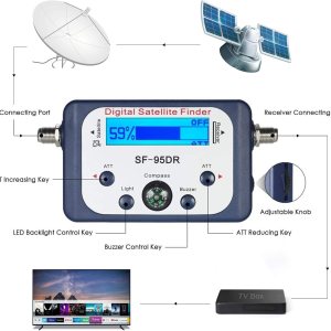 Descripción: Buscador de medidor de señal satelital digital muy potente que es capaz de encontrar satélites de una manera muy rápida en 15 minutos si no hay accidente. Es muy ligero y compacto, muy cómodo de usar. Los conectores anticorrosión también aseguran un uso prolongado y es muy digno de probar. Especificaciones: Frecuencia de entrada: 950-2150 MHz Nivel de entrada mínimo: -40dBm Nivel de entrada máximo: -10dBm Impedancia de entrada: 75 Ohmio, conector F Impedancia de salida: 75 Ohmio, conector F Fuente de alimentación: CC 13/18 V Rango de funcionamiento (LNB ganancia): 52-60dB El paquete incluye: 1 instrucciones. 1 buscador de medidor de señal satelital digital 1 brújula gratis. Preguntas y respuestas: 1. ¿Cómo instalar el buscador de satélite y detectar la señal? a. Conecta un cable de salto desde LNB al puerto «Satélite» del buscador de satélites. Conecta el puerto «receptor», una potencia CC de 1318 V que proviene del receptor de satélite. b. Asegúrate de que el buscador de satélite esté correctamente conectado. Conecta el cable de CA y enciende el receptor de satélite c. Establece que el dB sea 1 o 2 por el botón ATT, la señal LED mostrará de 15 a 30, luego puedes ajustar la posición del plato, cuando escuches la alerta del zumbador y el valor de la intensidad de la señal cada vez más, significa que obtienes la señal de estado. d. Ajusta el dB para que sea de 3 o 4, ajusta el plato una y otra vez hasta que el valor de la intensidad de la señal sea máximo. Entonces puedes ver la luz LOCK en el receptor de satélite, si la luz de bloqueo está encendida, muestra que encuentras el satélite deseado. De lo contrario, necesitas ajustar el plato de nuevo