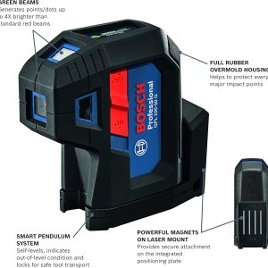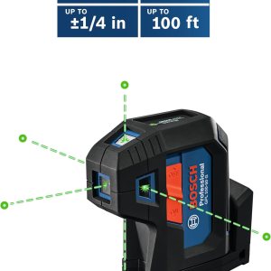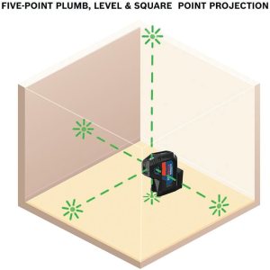 Láseres de 5 puntos: proyecta 5 puntos verdes brillantes en la parte superior, inferior, izquierda, derecha y en la parte delantera. Este láser de punto de punto de alta precisión es ideal para proyectos de construcción que requieren cuadrar paredes de diseño y transferir y alinear puntos de plomada. Precaución: este es un láser de punto, no un láser de línea cruzada. Consulta el modelo GLL100GX o similar para opciones de línea cruzada., Haz verde, 125 pies: 4 veces más brillante que el láser rojo para una visibilidad óptima en lugares de trabajo interiores y parcialmente exteriores. Ofrece ± 1/8 pulgadas. Precisión a 30 pies. Para aplicaciones de plomada arriba/abajo, alineación y nivel (la precisión del punto inferior es de ± 1/4 pulgadas. a 30 pies), Autonivelación: el soporte magnético integrado gira 360° para una cobertura fácil y completa de la habitación en cualquier lugar. El péndulo inteligente se nivela automáticamente hasta 4°, indica una condición fuera de nivel parpadeando las luces para garantizar que siempre tengas la medición de nivelación más precisa., Batería de larga duración: la tecnología VisiMax integrada monitorea el consumo de energía para maximizar la visibilidad de la línea y prolongar eficazmente la vida de la batería., Protección contra impactos: viene con una carcasa de goma integrada y resistente diseñada para actuar como una jaula enrollable, asegurando una excelente protección del láser cuando se cae duro en el suelo. Lentes empotrables para la máxima durabilidad. También incluye (2) pilas AA y una funda de transporte rígida para mayor comodidad y protección adicional.