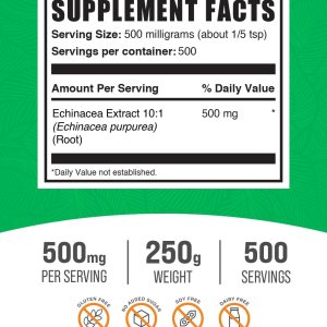 Fuente de antioxidantes: la equinácea es una planta con flores que contiene compuestos esenciales, incluidos polisacáridos. Este producto de equinácea es la forma de extracto en polvo. El extracto de equinácea, uno de los suplementos a base de hierbas, es una rica fuente de antioxidantes que pueden ayudar a proteger el cuerpo de los radicales libres nocivos. Es una gran adición a cualquier dieta para un impulso antioxidante. *, Mejora la salud inmunológica: como fuente de antioxidantes, extracto de equinácea, un suplemento de defensa inmune, es uno de los suplementos herbales que ayuda a apoyar la salud inmunológica. * Además, el extracto de equinácea, un suplemento de inmunidad, puede ayudar a fortalecer las defensas naturales del cuerpo contra factores nocivos. * Es una forma natural de apoyar la salud en general. *, ✔️ Apoya la piel vibrante y saludable: el extracto de equinácea o el extracto de raíz de equinácea, también puede ayudar a apoyar la piel. * Con su rica fuente de antioxidantes, la equinácea puede apoyar la salud y elasticidad de la piel, así como actuar como apoyo inmunológico para las personas. * Este suplemento natural es una gran adición para aquellos que buscan apoyar la salud de la piel. *, ✨ Suplemento puro y natural: nuestro extracto de equinácea, uno de los suplementos de hierbas para apoyo inmunológico, es puro y natural sin ningún relleno, aditivos y sabores artificiales. No solo que este extracto de raíz de equinácea es libre de relleno, también es libre de gluten, sin soja, sin lácteos y especialmente sin azúcar añadido., ⭐ Alta calidad: todos los productos de BulkSupplements se fabrican de acuerdo con las normas cGMP para garantizar la más alta calidad para operaciones de fabricación, embalaje, etiquetado y mantenimiento. Hemos hecho una inversión significativa en nuestro laboratorio interno para que podamos probar nuestros productos en múltiples etapas durante la producción. Probamos productos, procedimientos y equipos de terceros cuando sea necesario para garantizar el cumplimiento, las normas y la consistencia.