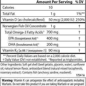 Promueve la función del sistema de circulación saludable, Apoya la salud de los huesos y del sistema inmunit, Proporciona 700 mg de omega-3, incluyendo EPA y DHA, Incluye 2.000 UI (50 mcg) de vitamina D3 y 90 mcg de vitamina K2 como MK-7, Frescura, potencia y pureza garantizada