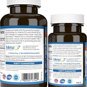 Promueve la función del sistema de circulación saludable Apoya la salud de los huesos y del sistema inmunit Proporciona 700 mg de omega-3, incluyendo EPA y DHA Incluye 2.000 UI (50 mcg) de vitamina D3 y 90 mcg de vitamina K2 como MK-7 Frescura, potencia y pureza garantizada