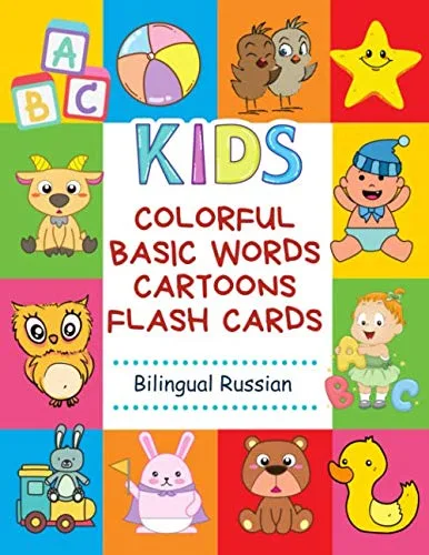 Colorful Basic Words Cartoons Flash Cards Bilingual Russian Easy and fun learning baby first book. 100+ card games to practice vocabulary in use.