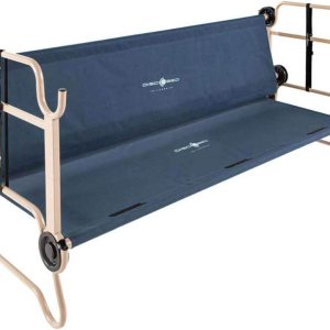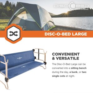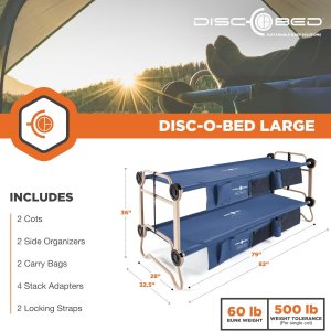 Cuna doble compacta: la litera grande Disc O Bed proporciona un montón de espacio para relajarse y relajarse mientras ocupa menos espacio que una tienda de campaña para 3 personas; las cunas compactas y cómodas se colocan a 11.0 in del suelo con 20.9 in entre cunas, Múltiples usos: utilizar como 2 cunas separadas, un banco de asiento o literas, Construcción duradera: marco de acero inoxidable con recubrimiento en polvo y antioxidante; hecho de tela de poliéster 600D azul marino, recubierto de PVC; marco redondeado que no se hunde en el suelo, Características: viene con 2 cunas, 2 organizadores laterales, 2 bolsas de transporte, juego de adaptadores apilables y 2 correas de bloqueo; los organizadores laterales cuelgan del lado de las cunas para sostener equipo o artículos personales, Especificaciones: Capacidad de peso del usuario: 500.4 lbs por cuna; Dimensiones (zona de dormir): 78.7 x 28.0 in; Dimensiones (exterior): 81.9 x 32.3 x 35.8 in; Dimensiones de la bolsa de transporte: 32.3 x 15.0 x 5.0 in; Peso: 59.5 lbs