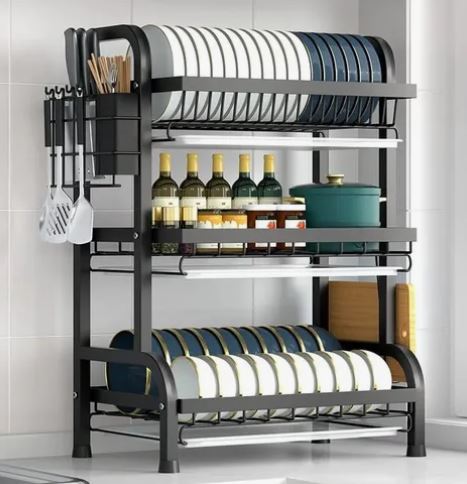 Se entrega de 24 a 48 horas - Escurridor de trastes - Dimensiones aproximadas de 42 L x 23,5 W x 61 H (cm). Incluye rejilla principal de tres capas, soporte para palillos, rejilla para cuchillos y rejilla para tabla de cortar. Capacidad para almacenar platos, vajillas, botellas de condimentos, tablas de cortar, cuchillos y otros utensilios de cocina.Estructura escurridor - Diseño en forma de T con barra de soporte gruesa y pies giratorios ajustables en la parte inferior para controlar la altura y proporcionar estabilidad, evitando balanceo. Capacidad de soporte de hasta 120 libras.Escurridor de trastes acero inoxidable - Acabado con pintura de poliéster para hornear, ofreciendo protección multicapa, resistencia al desgaste y a la suciedad. Superficie de pintura lisa y resistente a la decoloración.Escurridor de trastes fácil limpieza - Rejilla del tazón curvo desmontable para una limpieza sencilla. Cada capa cuenta con una bandeja receptora de agua de material pp, evitando ensuciar la encimera.