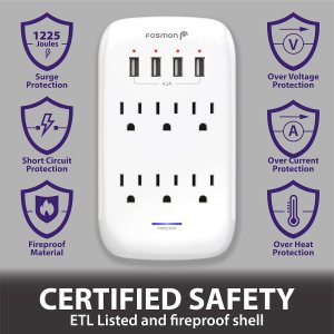 Estación de alimentación todo en uno: el protector de sobretensiones de Fosmon con puertos USB proporciona toda la capacidad de alimentación y carga que necesitas. Con 6 salidas de CA disponibles en esta toma de corriente múltiple, ya no te quedarás sin enchufes. Más que eso, puedes cargar fácilmente tus dispositivos USB con cuatro puertos de carga de alta velocidad, 5 V/4,2 A USB-A., Máxima protección: la toma de pared con puertos USB viene con un protector de sobretensiones de 1225 julios de alta capacidad. La luz LED iluminada indica que el protector funciona correctamente. La función de filtración de potencia suprimirá el ruido de potencia causado por EMI y RFI, y aumentará la vida útil de tus electrodomésticos. Los puertos USB proporcionan protección contra sobrecarga, sobretensión y sobrecorriente para garantizar un proceso de carga seguro y suave., Construcción de calidad y seguridad certificada: la seguridad del protector de sobretensiones está certificada por ETL y cumple con las normas UL498A y UL1449. La carcasa de la toma de corriente múltiple es duradera e ignífuga, por lo que es muy segura de usar., Compatible y portátil: el protector de sobretensiones Fosmon es compatible tanto con tomas estándar como decorativas. Cuando se utiliza con tomas GFCI o USB, el poste estabilizador puede necesitar ser cortado debido al mayor espacio entre dos enchufes. El protector de sobretensiones es compacto y ligero, por lo que es ideal para el hogar, oficinas, hoteles, tiendas o sobre la marcha., [Garantía limitada de por vida] Únete a millones de clientes satisfechos con nuestra garantía limitada de por vida, respaldado por nuestro experimentado y dedicado servicio al cliente con sede en Estados Unidos.