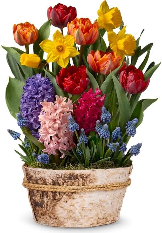Incluye: jardín de bulbos de narcisos amarillos, tulipanes rojos, tulipanes naranjas, jacinto rosa, jacinto morado, jacinto rosa intenso, muscari azul (jacinto de uva) + recipiente de madera Para garantizar la máxima frescura, todos los pedidos se entregan directamente a la puerta de su destinatario, empaquetados de forma segura para evitar daños durante el tránsito. La fecha de llegada se puede confirmar durante el pago. Guía de cuidado de plantas frescas incluida. Llega inactivo en forma de bulbo. Florece en 1-3 semanas. Para incluir un mensaje personalizado gratuito en su pedido, marque la casilla "Este es un regalo" en su carrito o al finalizar la compra. ¡Envía una nota personalizada y reflexiva para un toque especial y personal!