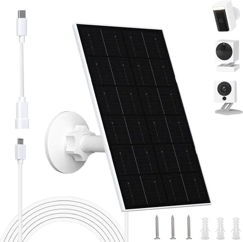 Panel solar para cámara Wyze: este panel solar de 4W funciona con Wyze Cam Outdoor v1, v2 y Battery Cam Pro para proporcionar energía estable y continua para su configuración al aire libre. Con una salida Micro USB y un adaptador USB-C, es compatible con múltiples modelos con batería Wyze. No es compatible con Arlo, Blink, Ring, Google Nest, Kasa, o cualquier cámara enchufable/no recargable. Carga solar de alta eficiencia: Equipado con un avanzado panel solar monocristalino de 4W, este panel solar para cámara de seguridad ofrece energía confiable incluso en condiciones de poca luz o clima nublado. Mantiene tu cámara cargada a batería durante todo el día, reduciendo la necesidad de carga manual o reemplazo de la batería al tiempo que reduce los costos de electricidad. Montura ajustable de 360° y cable largo para fácil instalación: Incluye un soporte giratorio de 360° y un cable de carga de 3 metros (9.8 pies), lo que permite una colocación flexible para capturar la máxima luz solar. Ya sea instalado en paredes, vallas, árboles o postes, el cable largo le permite colocar el panel solar para la cámara Wyze donde obtenga la exposición óptima al sol sin estar limitado por la ubicación de la cámara. Garantiza una carga eficiente y fiable en todos los entornos exteriores. IP66 Resistente al Agua para Uso en Exteriores: Este panel solar de 4W adopta un recubrimiento impermeable IP66, que puede resistir eficazmente la lluvia, la nieve, el viento, la arena y el polvo, asegurando un suministro de energía continuo y estable en varios entornos exteriores con costos de mantenimiento extremadamente bajos. Es adecuado para jardines, entradas o cualquier área al aire libre, y puede proporcionar energía continuamente a tu cámara sin importar el clima. Instalación sin esfuerzo: viene con todos los accesorios de montaje necesarios para una configuración sin complicaciones. Simplemente taladra y asegura el soporte ajustable de 360°, ajusta el panel para una exposición óptima al sol y conecta el cable de carga a tu cámara. No se requieren herramientas ni cableado complicado. La instalación tarda solo unos minutos.