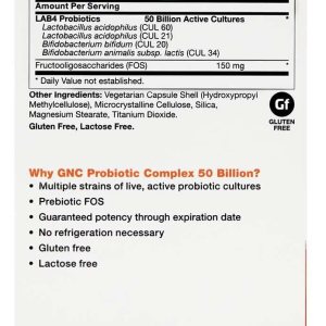 GNC Probiotics Complex Daily Need – 50 Billion CFUs: A Healthy Gut Is A Good Thing. Don’t take your digestive health for granted—and don’t settle for support that isn’t based on science. GNC Probiotic Solutions are formulated with clinically studied, multi-strain probiotics and have guaranteed potency through their expiration date with no refrigeration necessary. Designed For Digestive Support. Probiotics shouldn’t be one-size-fits-all. Your body is unique—and a targeted formula may provide Includes clinically studied probiotics May provide digestive and immune support* No refrigeration required Guaranteed potency through expiration date