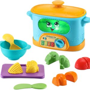 Pretende cortar cuatro verduras a la mitad y dejarlas caer en la olla para escuchar efectos de sonido, aprender frases y contar, Cuatro botones vegetales describen la comida y el color de las verduras, reproducen una melodía tonta, y sugieren recetas como sopa de arco iris, Escucha cinco recetas paso a paso que introducen palabras de vocabulario sobre alimentos, colores y números, Gira el dial de números para escuchar la olla decir la temperatura, luego mira cómo el panel frontal se ilumina con colores y pretender agua hirviendo, Diseñado para mayores de 12 meses; requiere 2 pilas AA; pilas incluidas solo para fines de demostración; se recomiendan pilas nuevas para uso regular