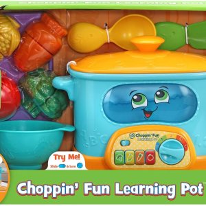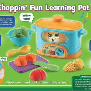 Prepara una receta para aprender con el Choppin’ Fun Learning Pot™. A los niños les encanta jugar a cocinar. Prepara brócoli, maíz, un tomate y una zanahoria con verduras separadas, un cuchillo de juego y una tabla de cortar. Escucha la olla responde con frases alentadoras mientras los niños añaden verduras a la maceta. ¡Vamos a hacer salsa de espagueti! Sigue cinco recetas paso a paso para fomentar el aprendizaje con el juego. Corta la comida y ajusta el dial de temperatura. Ahora pulsa un botón de comida y revuelve la olla para hacer salsa de espagueti, sopa de arcoíris, maíz en la mazorca, sopa de zanahoria y brócoli con queso. Mira la olla «hervir» con agua simulada en el panel frontal. Escucha el recuento de ollas hasta 10 y habla de colores mientras juegas. Sirve tu creación en el cuenco, coge la cuchara y cava. Todas las piezas se almacenan en o en la olla para una fácil limpieza cuando el tiempo de juego está terminado. ¡Sopa sabrosa! Diseñado para mayores de 12 meses. Funciona con 2 pilas AA. Pilas incluidas solo para fines de demostración. Se recomiendan nuevas baterías para uso regular.