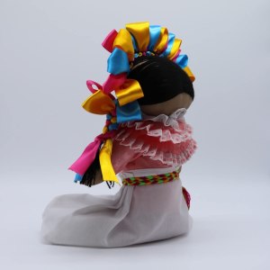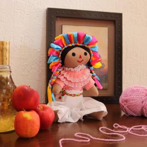MUÑECA ARTESANAL CON TRENZAS TEJIDAS Y VESTIDO ROSA CON BLANCO.