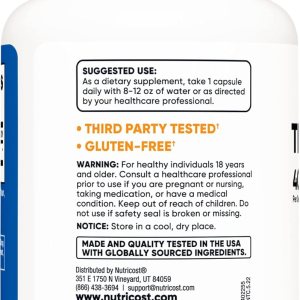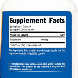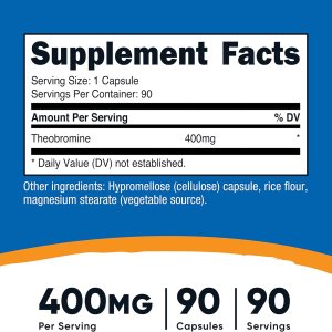 Nutricost Theobromine contiene 90 cápsulas vegetarianas con 400mg en cada porción.