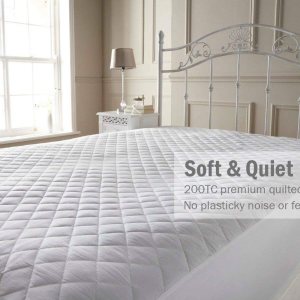 100% WATERPROOF: Shield your mattress against spills, accidents, and heat sweats with a waterproof, environmentally friendly TPU waterproof coating. Perfect for young families with children or pets., COOL & COMFORTABLE SLEEP: Made from 200TC high-quality cotton, so it’s not only super comfortable, but it’s also more breathable and better at regulating temperature for the sleep you dream of. Four Layer Protection, including microfiber filling for air circulation., NOISELESS: Vinyl-free, so no plasticky feel or annoying crinkly noises. Just a noise-free, free from worry, perfect night’s sleep., THE PERFECT FIT: Designed to fit snugly on all standard mattresses. Please select the right size for you or check our guide below for the fit you need., 100% SATISFACTION GUARANTEED: We’re so sure that our mattress protector offers all you and your family needs and more that’s why we back it with a full refund if you’re unhappy for any reason.