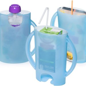 Dos unidades de soportes para mezclar, perfectos para viajar o alimentarse sobre la marcha. El recipiente es un plástico duro libre de BPA que evita que se apriete. Uso vertical para bloquear en bolsas de alimentos, voltear para sostener bolsas de jugo/cajas Se bloquea de forma segura en todas las principales marcas de bolsas de comida para bebés, y la mayoría de marcas de bolsas para salsa de manzana y yogur. Se puede usar como un recipiente para cajas de jugos y paquetes de jugo sin complicaciones. Fácil de usar, asas cerradas para atar, parte inferior abierta para la asistencia de los padres.