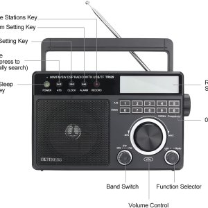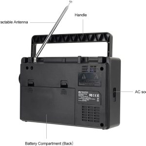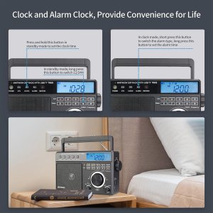 Radio AM/FM/SW de 3 bandas; FM (76-108 MHz); AM (522-1620 KHz); SW(2.3-21.19 MHz); múltiples bandas mejoran las capacidades de recepción; te permite elegir entre más estaciones de radio, La pantalla LCD mejora la visibilidad; la radio de escritorio muestra la potencia; frecuencia; hora de 12/24 horas; reloj despertador y nivel de volumen; diseño de retroiluminación que permite a los ancianos operar la radio fácilmente en la oscuridad, Reproducción de música externa; compatible con disco U (128G)/tarjeta Micro SD (128G); la radio digital puede reproducir tu música favorita en formato MP3/WMA; la tarjeta Micro SD o la unidad flash USB no están en el paquete, Grabación con un solo clic; inserta el disco U / tarjeta Micro SD (no incluida) en modo de radio; pulsa el botón de grabación para activar la función; graba los recursos de radio que te gusten, Métodos de fuente de alimentación opcionales; cable de carga de CA (incluido) te mantiene escuchando la radio en interiores; baterías 3 D (no incluidas) mantienen esta radio de onda corta lejos de cortes de energía, La versión actual ha eliminado la función de visualización de temperatura y el valor de paso AM se ha actualizado a 9/10 KHz