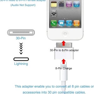 ¿Por qué elegirlo? Convertidor macho de 30 pines a hembra de 8 pines para cargadores o estaciones de acoplamiento. Inserta el cable de datos del iPhone en el puerto de 8 pines del convertidor, puedes cargar el iPhone 4 como un cable de datos normal. (Algunos accesorios de 30 pines pueden no ser aplicables). Plug and Play, fácil de usar. Diseño ligero y portátil, adecuado como regalo para amigos o familiares., No es compatible con audio o vídeo: el convertidor solo soporta carga y transmisión de datos. No es compatible con salida de señal de audio analógica y video AUX. Se puede utilizar para conectar tus smartphones, tabletas y mucho más. Puedes utilizar el cable de carga original del iPhone para cargar tus dispositivos de 30 pines., Pequeño y portátil: este convertidor de 30 pines a Lightning te permite conectar dispositivos con accesorios de 30 pines a muchos conectores de 8 pines. Este convertidor para iPhone es pequeño, tan grande como una tapa de botella. Fácil de poner en tu bolso o bolsillo, conveniente para viajes o uso en interiores., Amplia compatibilidad: se adapta al nuevo sistema de iPhone, no limitado por la versión iOS. Interfaz de 30 pines compatible con iPhone 4/4s/3G/3G, iPad 3/2/1, iPod nano 5ª/6ª generación y iPod Touch de 3ª/4ª generación. Puedes conectar los cables Lightning para iPhone de 8 pines a dispositivos antiguos, componentes o bases de carga con puertos de 30 pines. Muy adecuado para cargar iPhone y iPad antiguos con cargadores y dispositivos de acoplamiento. (Nota: solo para carga, no es compatible con salida de audio), Lo que obtienes: recibirás un convertidor de 30 pines macho a 8 pines hembra. Si tienes alguna pregunta sobre nuestro adaptador Lightning a 30 pines, te proporcionaremos activamente servicios.