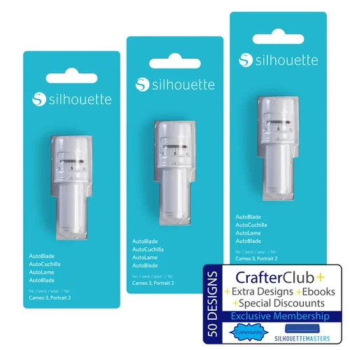 Pack de 3 AutoBlades: Cuchillas de corte de precisión compatibles con CAMEO 3 y Portrait 2, fabricadas en aleación de tungsteno duradera. Membresía CrafterClub+: Obtenga acceso a recursos de creación, soporte y ventajas especiales para mejorar su viaje creativo. Silhouette Masters Community: Conéctese con una red de artesanos para compartir ideas, aprender técnicas y encontrar inspiración. 50 diseños listos para usar: amplía tu biblioteca creativa con un conjunto de diseños seleccionados para usar en Silhouette Studio. Ajuste automático de la hoja: Deje que su máquina maneje los ajustes para un corte preciso, con longitudes de hoja que van desde 0.004 in hasta 0.039 in.