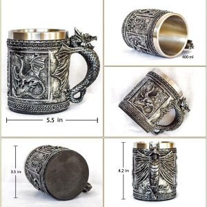 Es un gran regalo para miembros de DnD, fanáticos de GOT, coleccionistas de dragones, tu cultura vikinga, nórdica, medieval y fanáticos de la ciencia. Bonita taza para usar durante las noches de juego o una fiesta temática., Un iniciador de conversación seguro. Funciona bien para beber cerveza, café, leche o té. También es ideal como soporte para bolígrafos de escritorio, soporte para pinceles de artistas, soporte de maquillaje o adorno de estante., Diseño sutil y bien detallado. El exterior está totalmente hecho de material grueso de polirresina. La taza interior de acero inoxidable no sale, ya que el pequeño acolchado en el interior de las tazas extraíbles no mantendrá el metal en su lugar durante mucho tiempo, y el riesgo de que se pele o se caiga., Es una taza resistente y hecha a mano. Cada pieza está pintada y pulida a mano individualmente, el tono de color puede variar ligeramente del de las imágenes, lo que le da un aspecto único., Seguro para el calor, apto para alimentos, apto para lavavajillas La mayoría de nosotros bebemos en la hora feliz, por lo que sería divertido de una taza interesante. Un artículo de alta calidad que te dará años de placer.