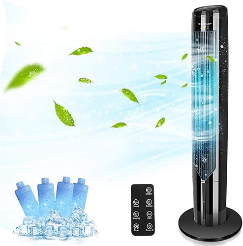 【Ventilador de torre ahorrador de energía y ecológico】Ventilador de torre con tanque de agua de 2,5 l, 4 cajas de hielo gratis, enfría mucho más que otros ventiladores de pie, y comparado a tu costoso aire acondicionado, no tiene compresor y no emplea refrigerantes químicos, sólo agua y un ventilador para lograr el resultado. Es más ecológico y seguro para tu salud. 【Doble control con pantalla LED y varios modos】Ventilador de torre con control remoto y panel de control, pantalla LED (encendido/apagado), alcance de control remoto: hasta 20 pies, El temporizador apaga automáticamente el ventilador después del tiempo seleccionado (1-9h) El modo «dormir» (Sleeping) combina 3 modos de velocidad: alta velocidad funciona durante 30 minutos y luego cambia de continuo a baja velocidad (velocidad media funciona durante 60 minutos y luego cambia de continuo a baja velocidad). 【Ventilador silencioso que oscila en 60°】Ventilador de agua compacto con oscilación en 60°, diseñado hábilmente para generar poco ruido que no te interrumpirá el sueño, sumérgete en un descanso reparador durante noches calurosas de verano, excelente enfriador de aire personal. 【Fácil de montar y seguro para niños】Saca el ventilador compacto de la caja y móntalo en cuestión de minutos para empezar a disfrutar la brisa refrescante con cubierta estrecha para no causar daño a los niños. Ideal para cocina, sala de estar, dormitorio y oficina. Precaución: No colocar la caja de hielo en el tanque de agua cuando esté lleno, o que causaría derrame de agua. No abrir la caja de hielo ni intentar poner el gel refrigerante directamente en el tanque de agua, lo que dañaría la bomba de agua.